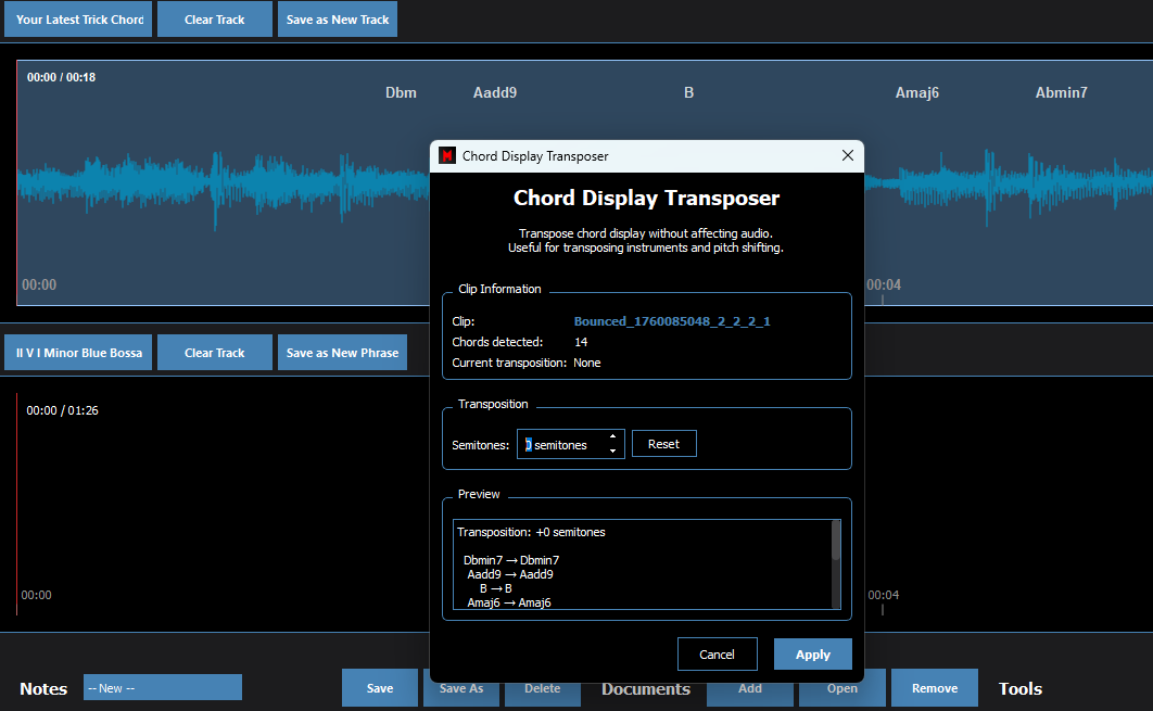 Extract Chords from complex audio, and transpose them for your Instrument. Insert chords as Markers in your tracks.