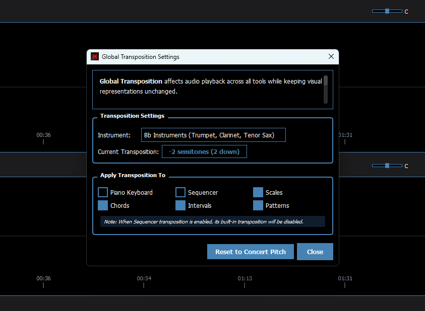 Thanks to Global Transposition, every Mingus app adapts seamlessly for transposing instruments.
