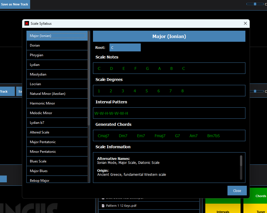 Access a comprehensive Scale Syllabus App and a Chord Syllabus App with extensive scale and chord information and piano sound on mouse hover.