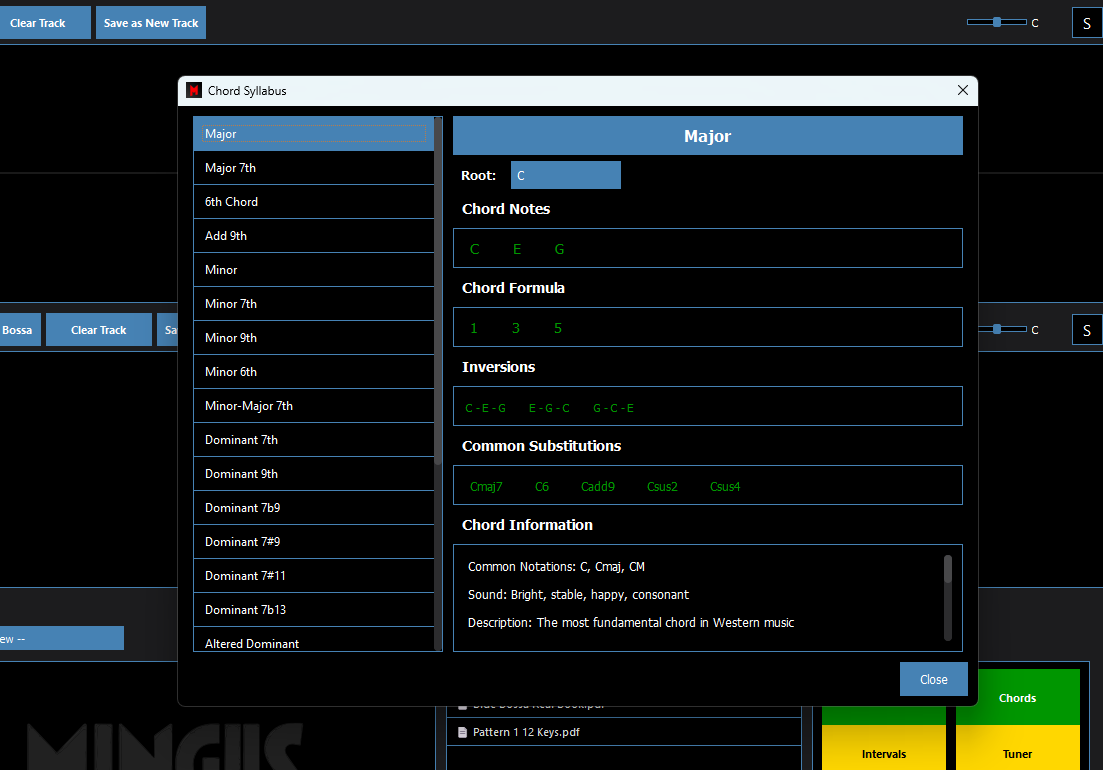 The Chord Syllabus App is a great learning and creative musical tool in Mingus. A comprehensive glossary of chord types in ALL KEYS!