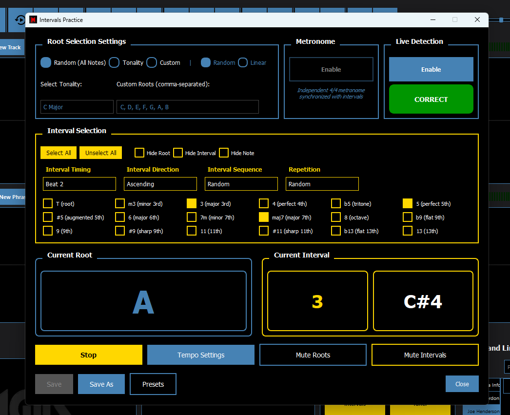 • Play roots randomly, following a tonality, or select specific roots to practice.