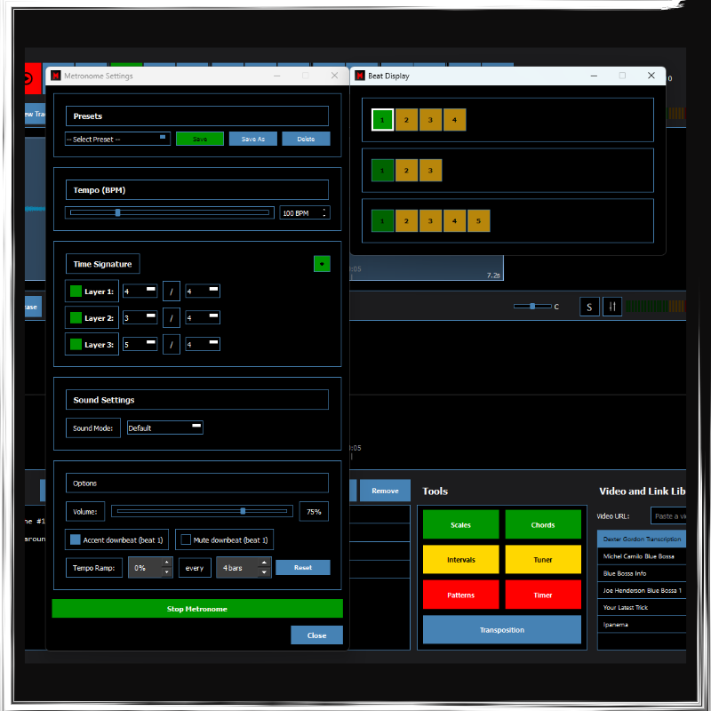 - Advanced Multi layer Metronome with Beat Display (metronome with three layers of time signature for advanced tempos. Beat display for visual representation of each beat)