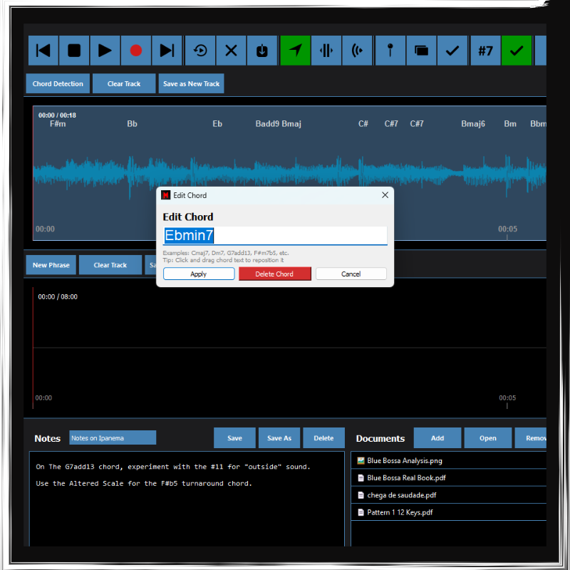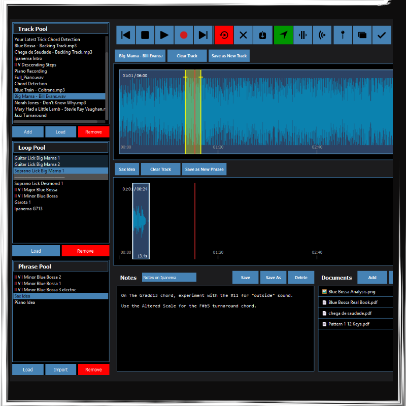- Phrase Pool (save and rememeber your licks and musical ideas to build vocabulary)