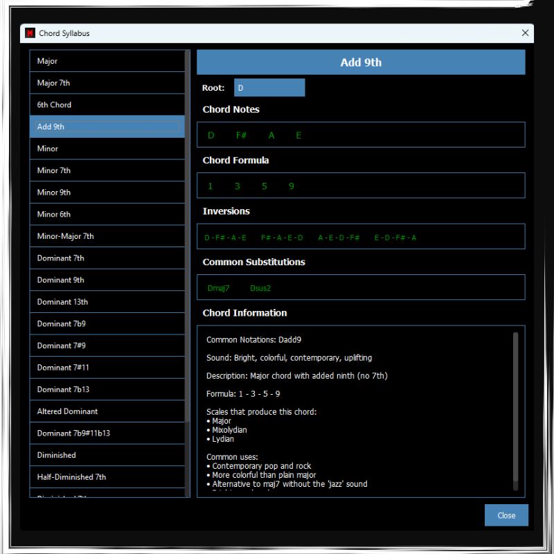 - Chord Syllabus (a Chords App with extensive info about many chords, that you can transpose to any key, and hear the actual chords by hovering)