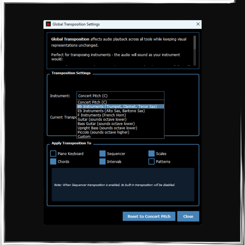 - Global Transposition (A core transposition algorythm that allows to use Mingus with any Transposing Instrument)