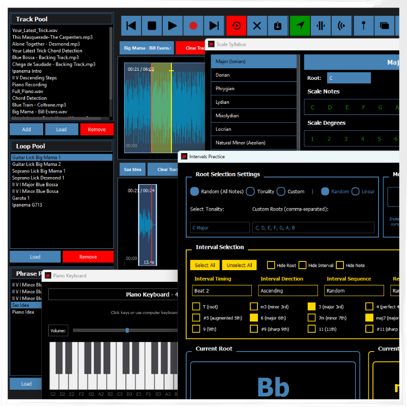 It’s a cool Software. Some features you can find in other apps, even for free, but it’s not bad to have them all in one place…. What I really like so far is the way the looping of sections works, this is great for practicing over tracks, which I do a lot, it really helps you learn your song sections fast and practice specific bits for improvisation. The Intervals app is also very useful, although I had a bit of trouble at the beginning to get the audio sound, but it works well. Still testing…