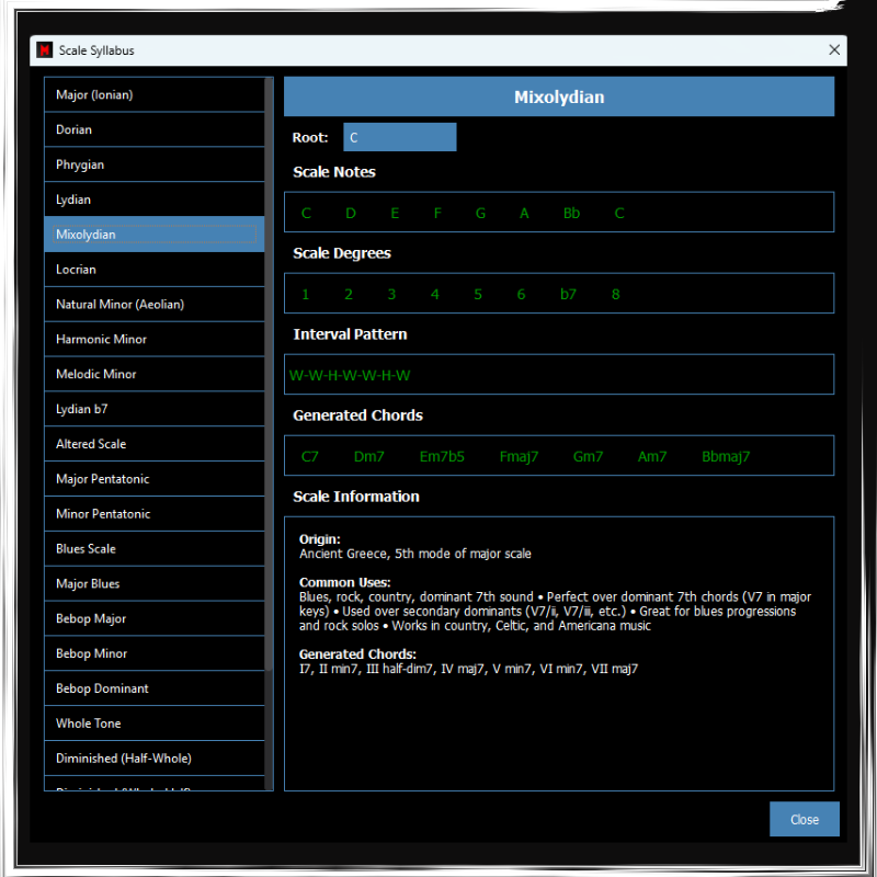 - Scale Syllabus (a Scale App with extensive info about many scales, that you can transpose to any key, and hear the actual notes of the scales by hovering))