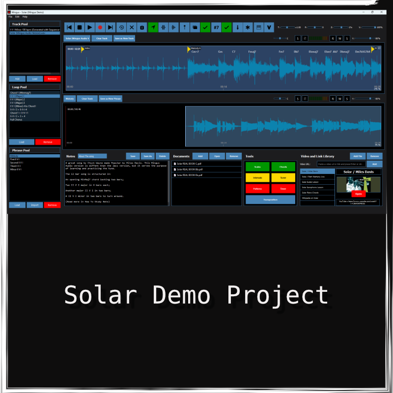 The Product Download includes the Demo Project Solar, created with a Backing Track of Solar, the Iconic tune by Chuck Wayne made popular by Miles Davis.